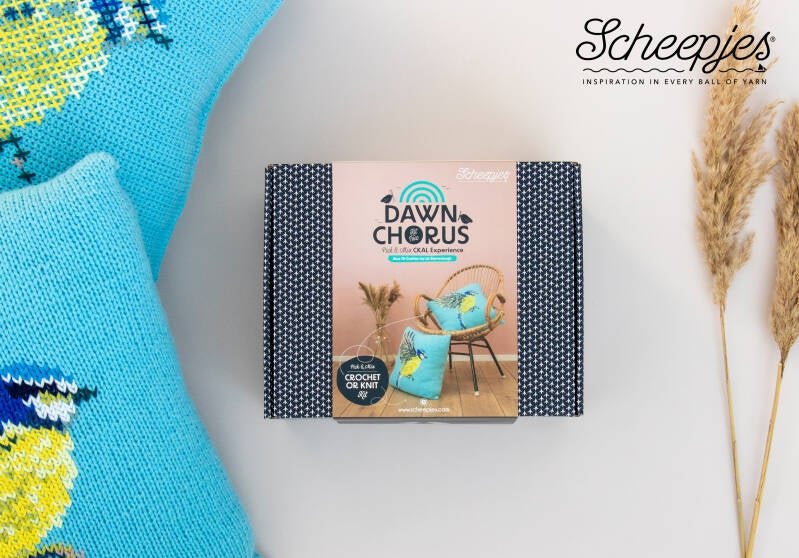 Onlangs is er door Scheepjes een CKAL gestart onder de naam Dawn Chorus Pick & Mix CKAL. Dit is een CKAL welke bestaat uit 3 projecten die na elkaar verschijnen. Deze CKAL's zijn gemaakt omdat het alweer 10 jaar geleden is dat zij hen eerste CAL uitbrachten. Als eerste is de Goldcrest scarf van designer Martin Up North verschenen, (zie 1e foto rechts) de tweede week van april is de Blue Tit Cushion van designer Liz Barraclough van start gegaan, (zie 2e foto rechts) en het derde project volgt na deze 4 wekelijkse CKAL.